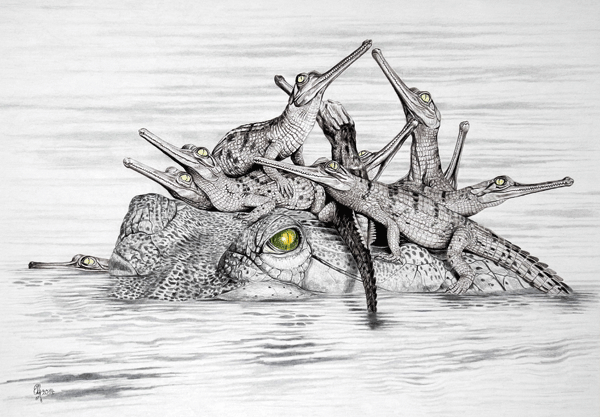 Gavialis gangeticus. Gavial-Mutter mit zahlreichem Nachwuchs auf dem Kopf.